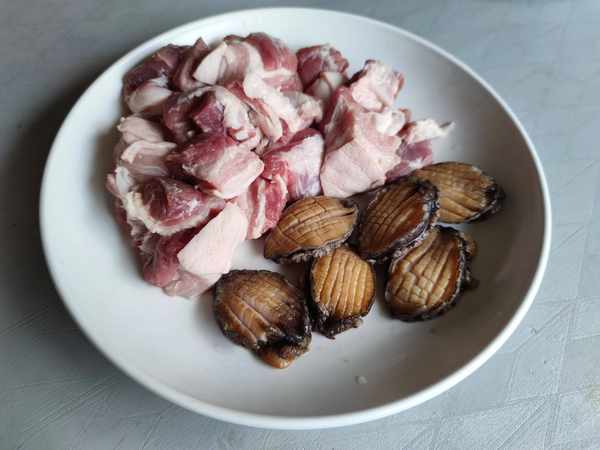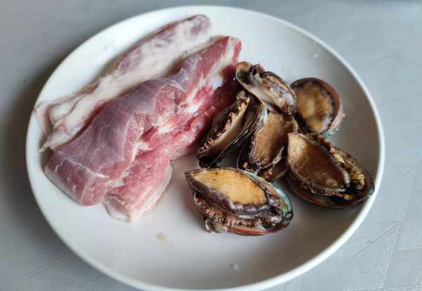 1.鲜活鲍鱼中加入面粉搓洗掉鲍鱼上面黑色的污渍,然后去壳取肉,五花肉皮面朝下在干锅中蹭至表皮起泡,取出刮洗干净。