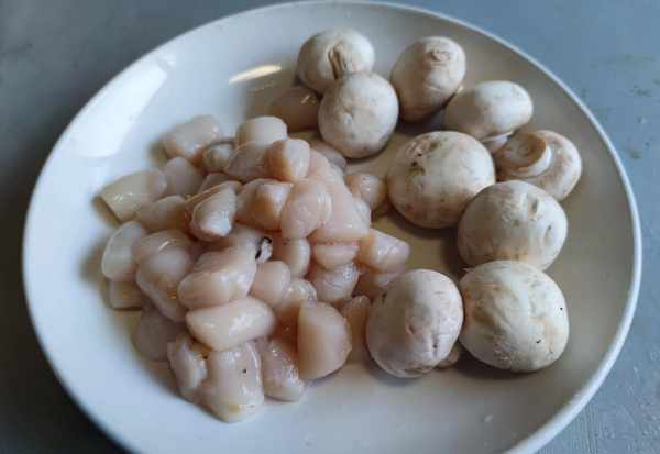 1.新鲜的现豁扇贝丁加入淡盐水中清洗干净后捞出,口蘑刷洗干净后切成厚片。