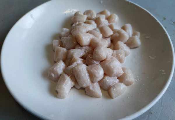 2.洗净的扇贝丁用厨房纸巾擦干水分,加入料酒、盐、胡椒粉、鸡蛋清和干淀粉抓拌均匀,腌制上浆。