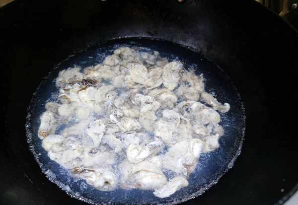 2.锅中烧水,水开后下入牡蛎肉,焯烫至牡蛎肉略微蜷缩后即可捞出过凉。