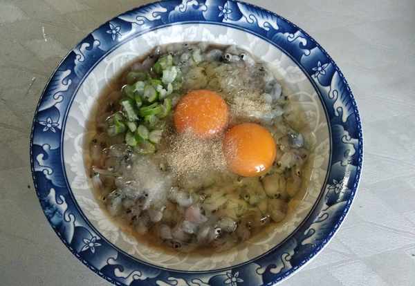 2.沥干水分后的小乌贼中打入鸡蛋,加入葱姜末、料酒、盐和胡椒粉搅拌均匀。