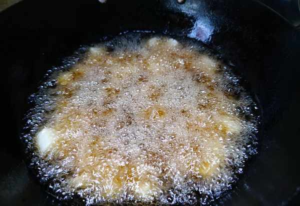 3.锅中入油,油温四成热时把扇贝丁逐个入锅,滑至扇贝丁变色浮起后捞出控油。