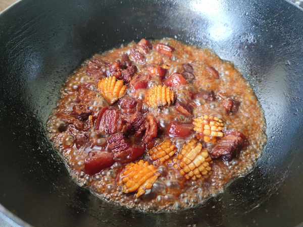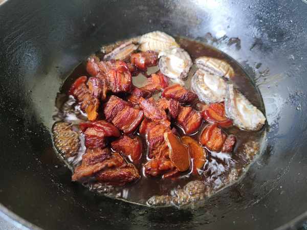 4.锅中下入少许油,放入冰糖炒出糖色,然后添入开水,把炒好的五花肉入锅,加入大块的葱姜蒜、料酒、一品鲜酱油和蚝油,大火烧开后转小火焖至五花肉软烂,把切好的鲍鱼入锅。