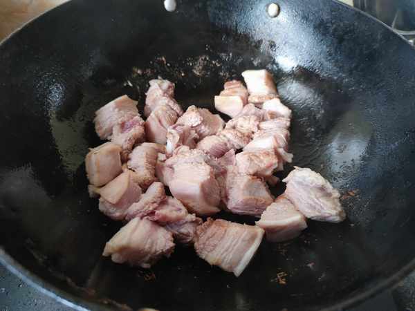 3.锅中入油,把五花肉入锅用小火煸炒至外皮焦黄,盛出来控去多余的油脂。
