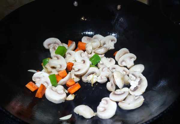 4.锅中留底油爆香葱姜蒜,下入口蘑和彩椒片翻炒均匀,把口蘑中的汁水炒出来。
