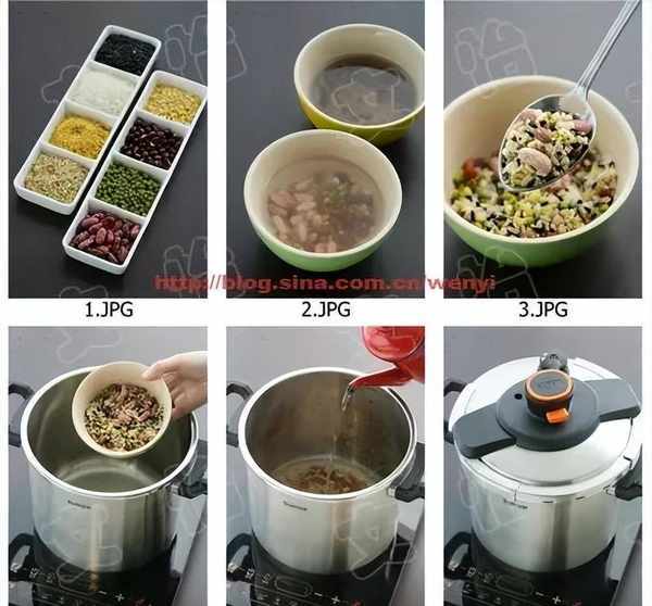 2)将泡好的米和豆子放入高压锅内,倒入清水,水量与正常煮饭的水量相同,即:水位与米面的距离约为。1厘米。