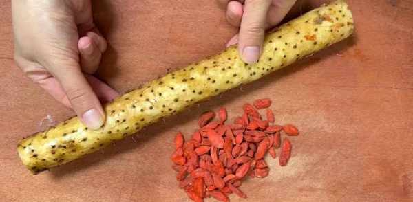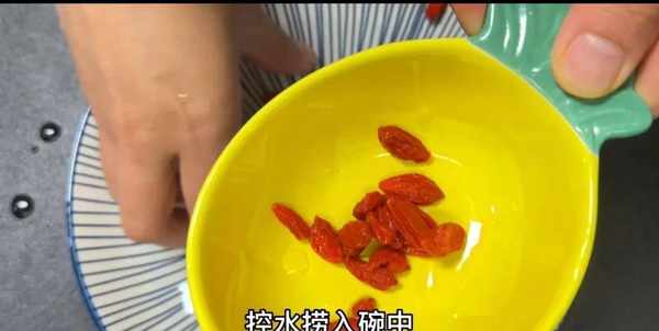 下次我们会准备一小把枸杞子。清洁枸杞非常重要。我们先用少许水湿润枸杞子,再加入少许淀粉盐先抓起来。
