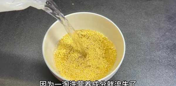 接下来,准备一个碗。倒入适量小米。很多朋友认为小米不能洗,因为洗了营养就流失了。