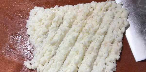 去皮的山药用刀压碎。然后用菜刀将其切碎。剁得越细越好。剁得越细越好吃,也越容易煮。