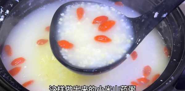 把水倒进碗里,放在一边备用。半个小时过去了,我们往锅里一看,哇,真香,用勺子搅拌两下,可以明显感觉到锅里的汤已经变得很浓稠了,小米和山药完全融合在一起了,散发出特别浓烈的香味,然后加入枸杞。