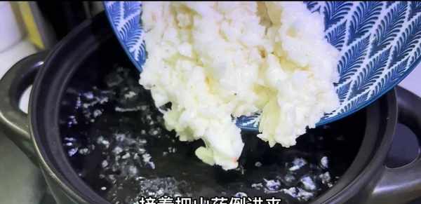 这里记住我们今天这道美食要用到的山药是棉山药,不要选择脆山药,棉山药的口感比脆山药好,搅拌一下加盖焖五分钟。