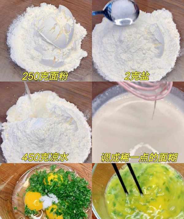 首先我们需要准备煎蛋卷的面糊。将250克面粉和2克盐混合,然后加入450克冷水和成稀面团。接下来,搅拌面条3分钟,记得要仔细搅拌,让面团更光滑。这使面团更柔软。