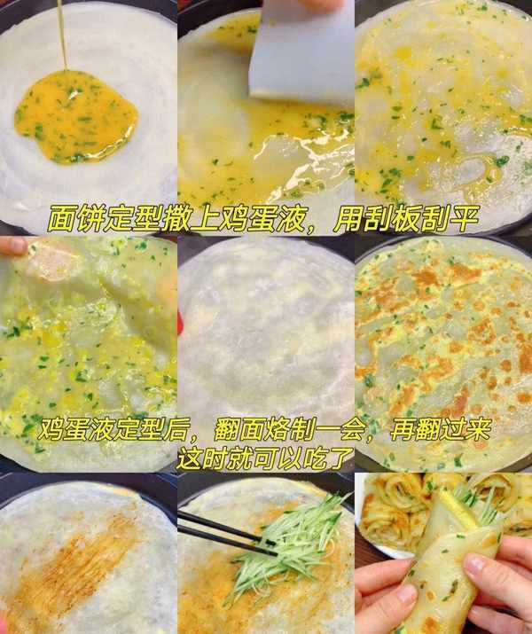 接下来,我们开始做煎蛋。平底锅预热,不用抹油。接下来,舀出两勺面团,用抹刀将面团均匀地摊开。待表面定型后,倒入打好的蛋液,用刮刀将蛋液抹平,淋上少许食用油,翻面煎至蛋液凝固,葱油饼就做好了。