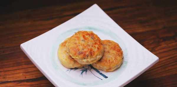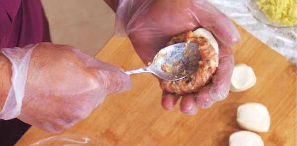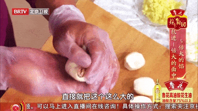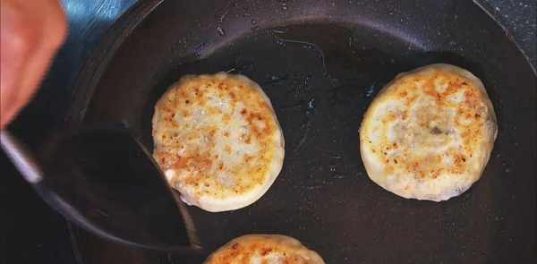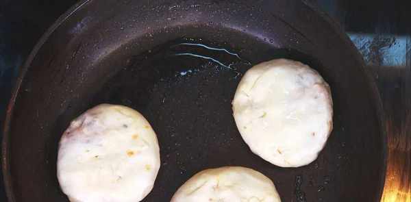 不用擀皮,把馅料铺在意面上面,用勺子和手把肉馅包在面皮里,合上嘴,压扁成饼状。