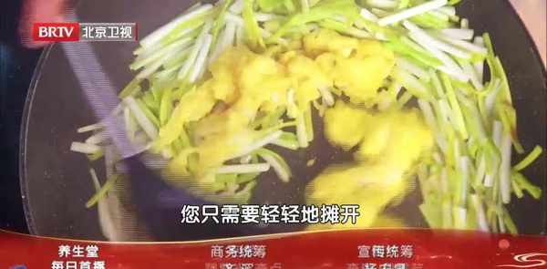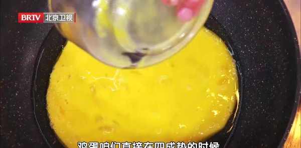 40%温度的油倒入蛋液中,凝固后关火倒出。