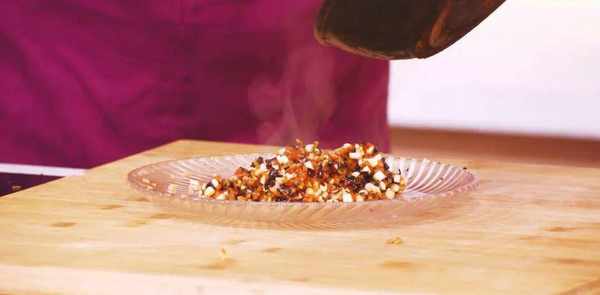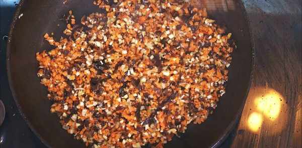 锅中油烧热,加入八角、刺灰稍炒,炒出香味后捞出香料。继续用食用油煎红葱头。洋葱变色后,加入切碎的胡萝卜和蘑菇,翻炒至熟。加入酱油和蚝油翻炒均匀。