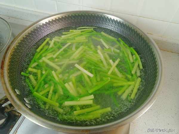 3、起锅烧水,水开加一勺盐和一勺食用油,然后把蒜苔倒进来焯水。
