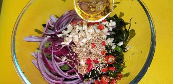 3、然后放入事先切好的洋葱、蒜末、辣小米、白芝麻、香菜和凉海带。享受的关键是在热油中注入绿色的烟雾。然后加入调味盐、蚝油、香油、鸡精、陈醋、生抽,拌匀。