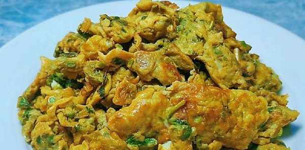 3、油热后,倒入香椿叶的汁液,将鸡蛋煎成型,煎好后关火装盘。香椿叶炒鸡蛋就做好了。