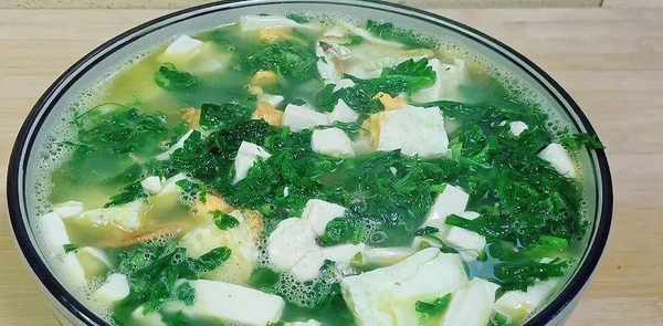 2、油烧热后倒入鸡蛋煎至两面金黄,用木勺切成小块。盖上沸水,同时用大火煮沸,使炖出的汤汁浓稠白净。加入豆腐煮一分钟左右,加入切碎的荠菜煮一分钟左右,加少许盐和胡椒粉调味即可,荠菜三鲜汤就做好了。