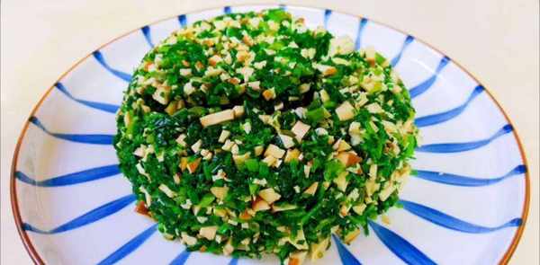 1.清理荠菜。锅内水烧开后,加入少许食盐,将荠菜焯水十秒左右。焯至变软变色,捞出,放入冷水中稍稍冷却,然后拧干。软豆腐切成小块。在一个小碗里打三个鸡蛋。