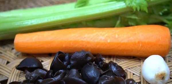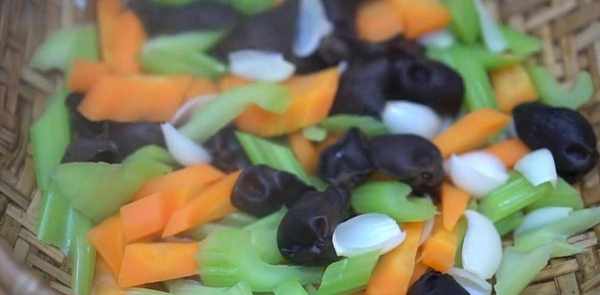 锅中加入适量的清水,水开之后把胡萝卜放在里面焯制1分钟左右,然后在下入芹菜、黑木耳和百合,煮开两分钟,然后捞出控水备用。