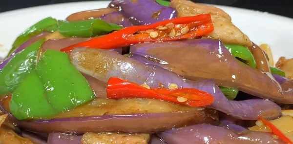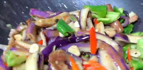 接着把青红椒也加进来,开大火翻炒,在倒入茄子,把茄子炒至入味,再把调好的料汁也加进来,继续开大火翻炒30秒左右,就可以出锅了。