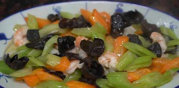 准备了一把芹菜,一个胡萝卜,一点泡花的木耳,适量的新鲜大虾备用。
