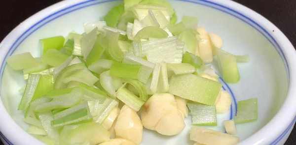 一块肥肉切成厚厚的薄片,大蒜用刀剁成蒜末,一块生姜切成姜丝,辣椒切细小一段。