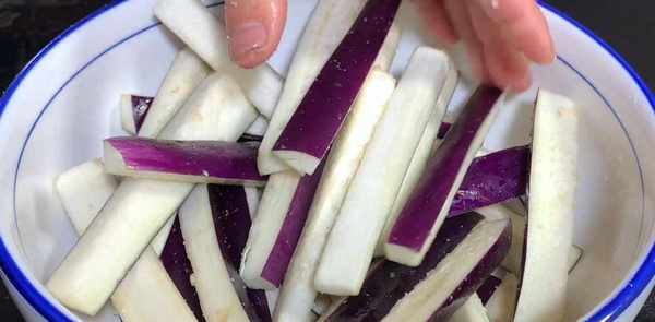 先准备两根新鲜的茄子,改刀切成小片,倒入一个大碗中,然后加入一勺食盐,用手抓拌均匀,再加入一点食用油,抓拌均匀,放一边腌制十分钟。