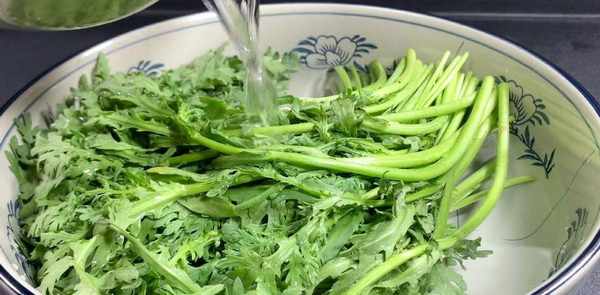 先准备一把茼蒿,清洗干净切成小段,放在一边备用。