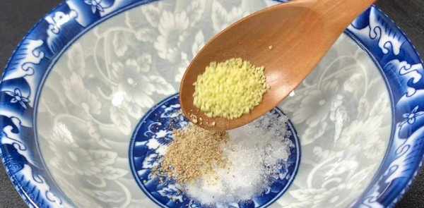 准备一个小碗,加入一勺食用盐、一勺鸡精,一勺生抽、一勺蚝油,少量的胡椒粉,一小勺白糖,用勺子搅拌均匀。