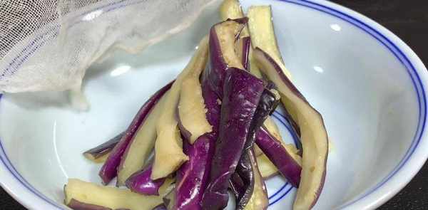 茄子腌制好后,把茄子的水分挤干,放到大碗里面,起锅加入食用油,油热把茄子放入锅中,炒一分钟左右,盛出来放到大碗里面备用。