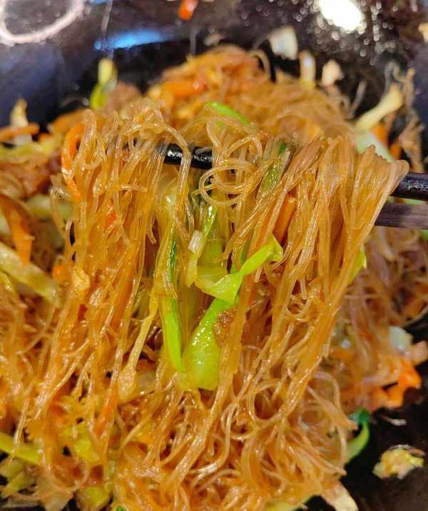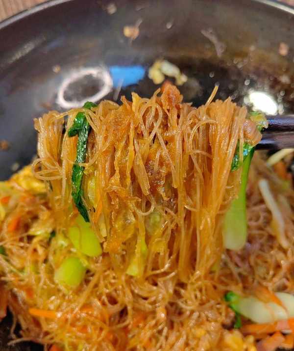 然后,将洋葱、大蒜、红辣椒炒香,加入切片的胡萝卜和卷心菜,炒至生。然后加入泡好的面条,加入酱油、炒面、盐和鸡汤调味,翻炒至顺滑。最后加入煎金黄的鸡蛋和青菜,开火快速翻炒1-2分钟,炒香即成。