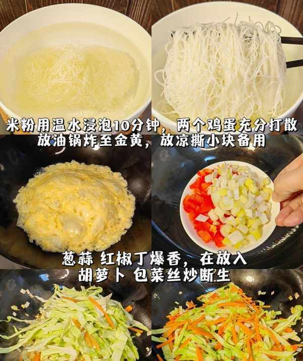 首先准备好所需的食材,包括米粉、鸡蛋、葱蒜、红辣椒、卷心菜、红萝卜、青菜、酱油、蚝油、炒面、盐和鸡高汤。米粉用温水浸泡10分钟,或用沸水浸泡3分钟左右,沥干备用。