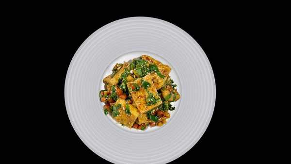 香菜洗净,沥干水分,切块加入酱汁、花生和炸豆腐,拌匀装盘。