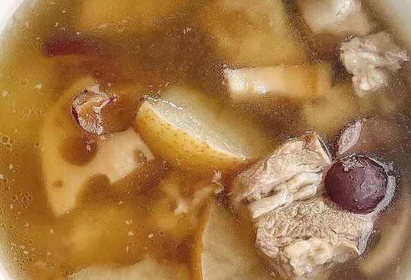 3、将排骨、雪梨、莲藕、红枣放入汤锅中,加入足量的水,用文火炖两个小时。