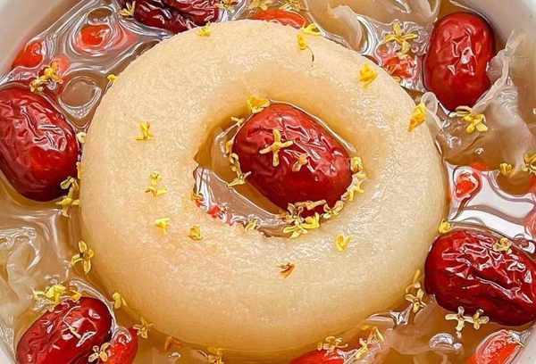 4、煮好后取出药明和糖水放入烤盘中,放入红枣、银耳和枸杞,盖上一层铝箔纸,放入烤箱200度烤20分钟。烤好后取出,撒上桂花,即可饮用。