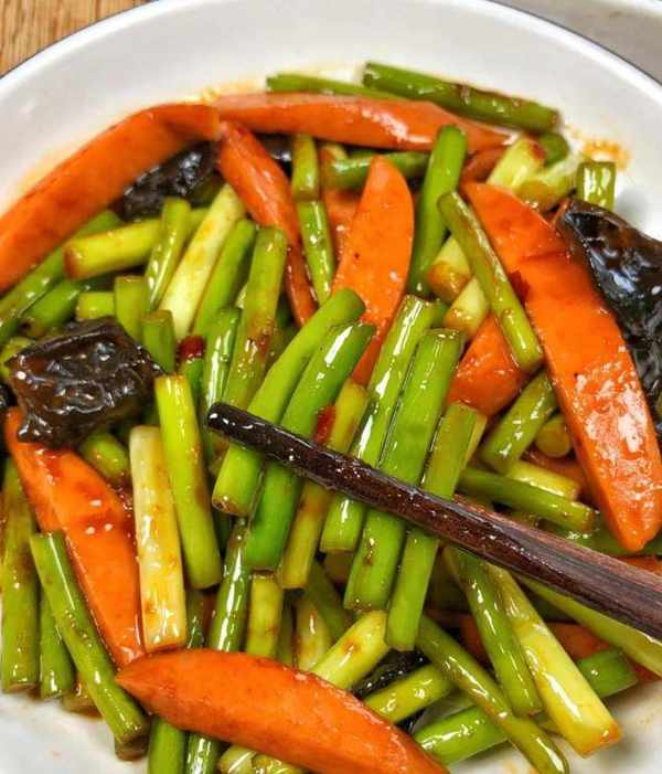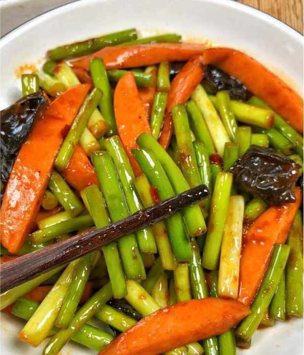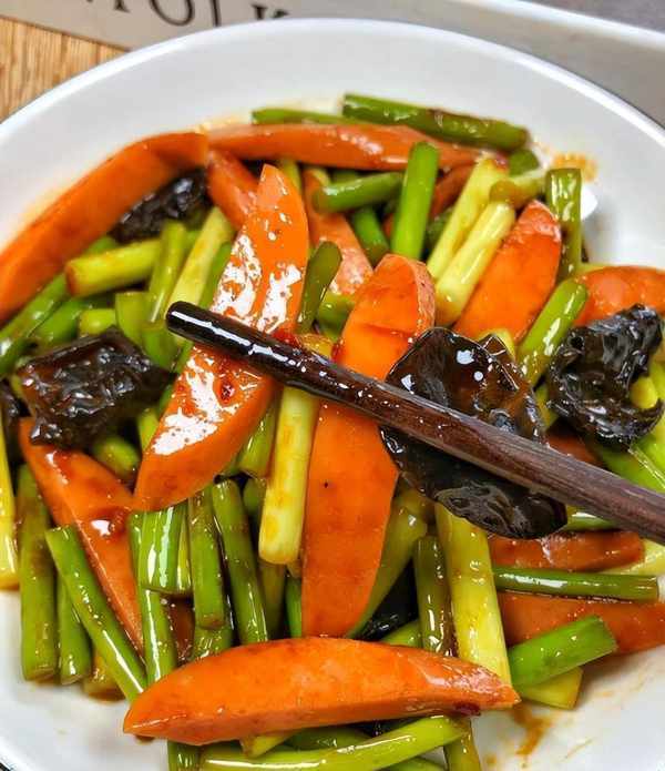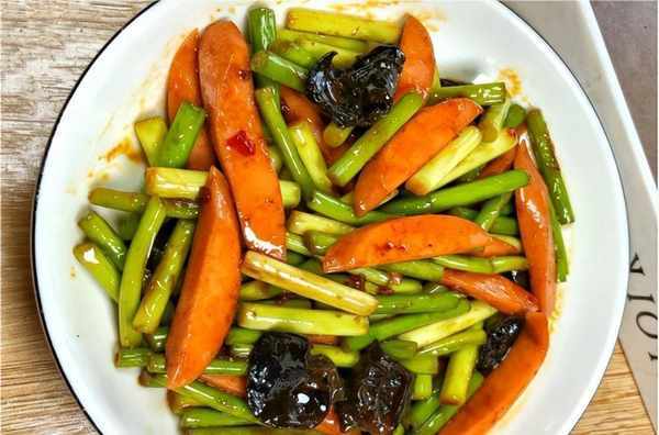 我们最喜欢的晚餐菜是蒜苔黑蘑菇炒火腿肠。蒜苔特别好吃。它与火腿香肠和黑蘑菇相结合,使这道菜更具吸引力并增强免疫系统。