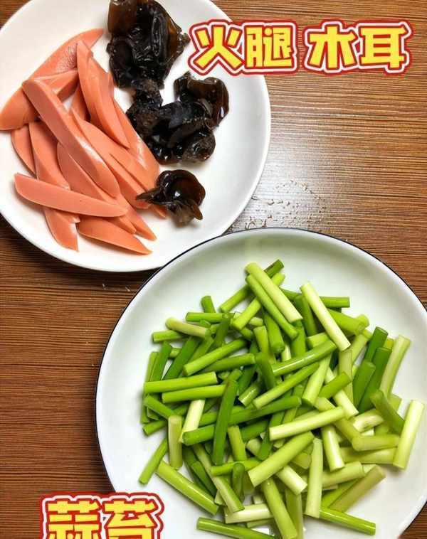 1:选用新鲜的蒜苔、火腿肠和黑蘑菇,先将蒜苔的根切掉,切掉黄尖,洗净切成数小块,水烧开,加一滴盐,加少许盐。香油一滴,将蒜苔煮2分钟,捞出放入冷水中,沥干水分待用。