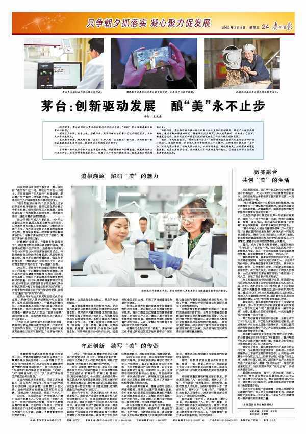 党的二十大报告提出,“创新是第一动力”“坚持创新在我国现代化建设全局中的核心地位”。迈向新征程,茅台深入学习贯彻党的二十大精神,始终坚持科技是第一生产力、人才是第一资源、创新是第一动力,以科学传承美、科技创新美,始终聚焦酿造更高质量、更高品质的茅台酒,更好满足人们对美好生活的向往,引领酒业科学与技术的高质量发展之路。