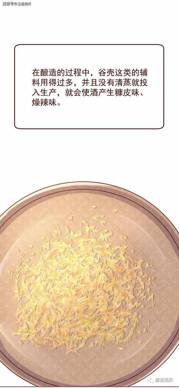 在酿造的过程中,谷壳这类的辅料用得过多,并且没有清蒸就投入生产,就会使酒产生糠皮味、燥辣味。
