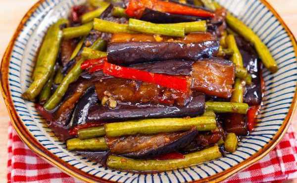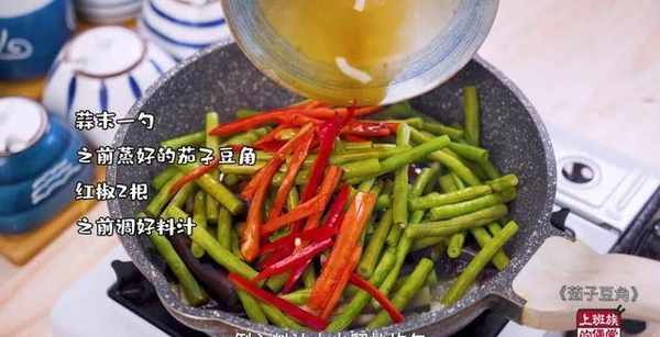 锅里油热下蒜末爆香,放蒸好的茄子豆角,红椒丝,倒入料汁,大火翻炒均匀,收收汁就可以出锅啦!