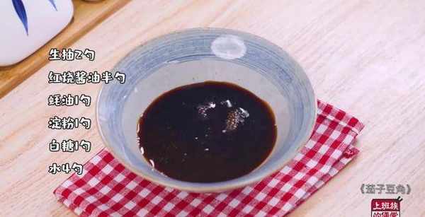我们再来调个料汁:2勺生抽、1勺蚝油、1勺淀粉、半勺红烧酱油、5克白糖、4勺水,搅拌均匀。