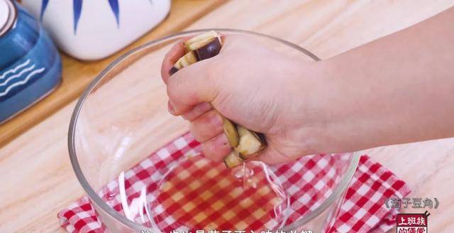 蒸好的茄子挤出水分,这一步也是茄子更入味的关键!