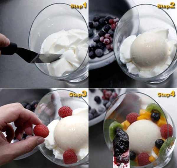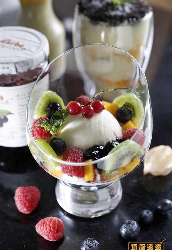 盒装奶酪1小盒、冰淇淋1球、蓝莓果酱10g、覆盆子4颗、蓝莓4颗、芒果丁20g、奇异果2片、薄荷叶2片