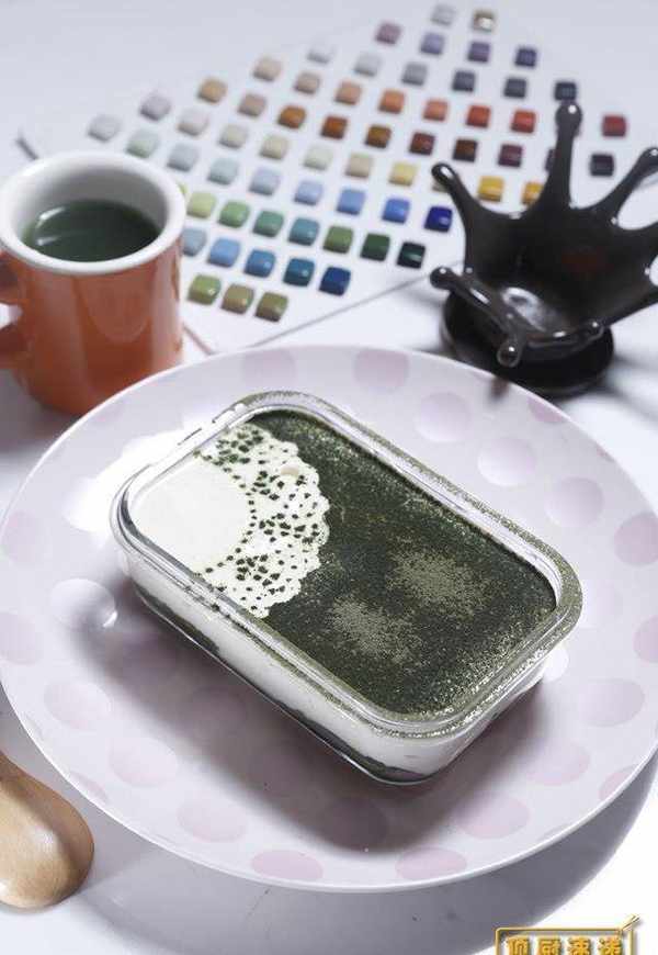 在容器上放上有镂空花样的纸板(可自己用纸板割出想要的图案),抹茶粉2g放入小筛网,均匀撒在蛋糕表面上,再将纸板移开即完成。