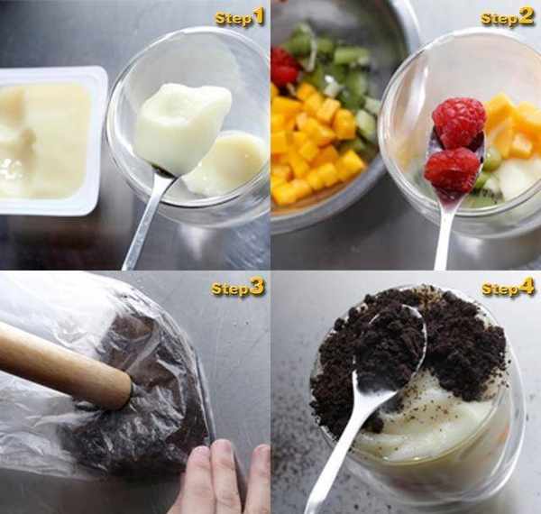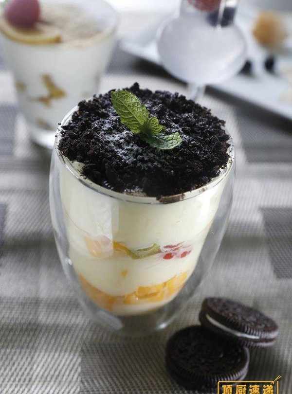 盒装水果豆花1小盒、芒果丁20g、覆盆子4颗、小蓝莓20g、奇异果丁20g、巧克力饼干碎4片、薄荷叶2片