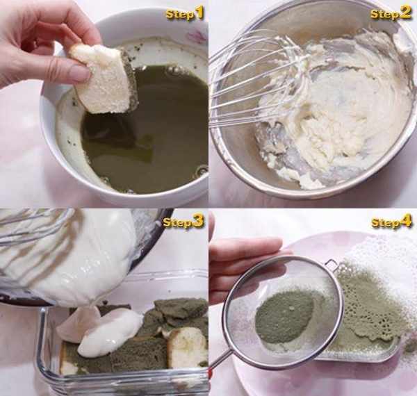 抹茶粉2g加温开水40c.c.泡成茶汤。两个杯子蛋糕各切成三片,每片正反面都蘸一点茶汤。