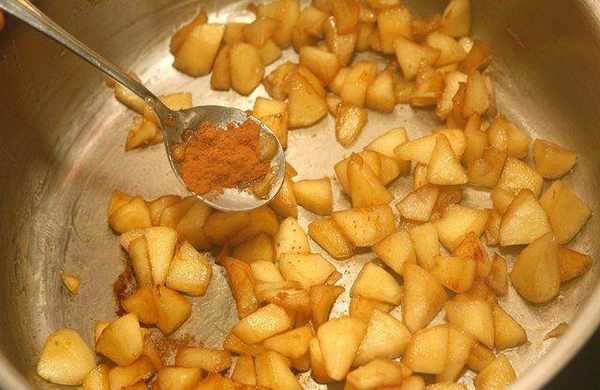炒好的苹果加入榛果酱、香草酱、蜂蜜与肉桂粉拌匀。